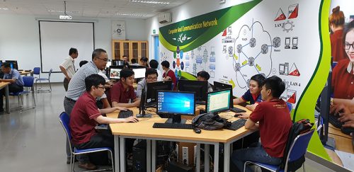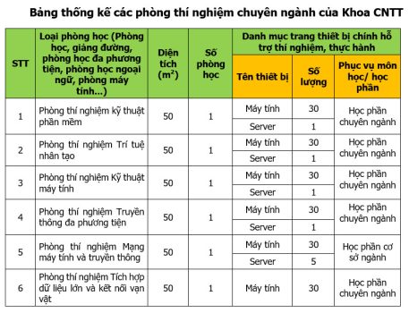 Các phòng thí nghiệm tại Khoa CNTT được tổ chức theo từng chuyên ngành riêng biệt, đảm bảo đủ số lượng máy tính, máy chủ (Server), các thiết bị, linh kiện đáp ứng cho 30 Học viên học cùng lúc.