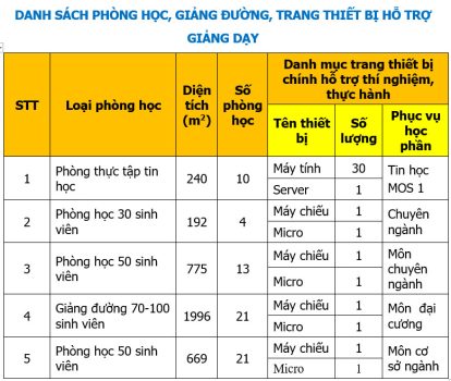 Chỉ tính riêng cơ sở An Phú Đông, nơi tổ chức đào tạo ngành CNTT, bảng dưới đây thống kê số lượng phòng học, giảng đường và trang thiết bị hỗ trợ giảng dạy.