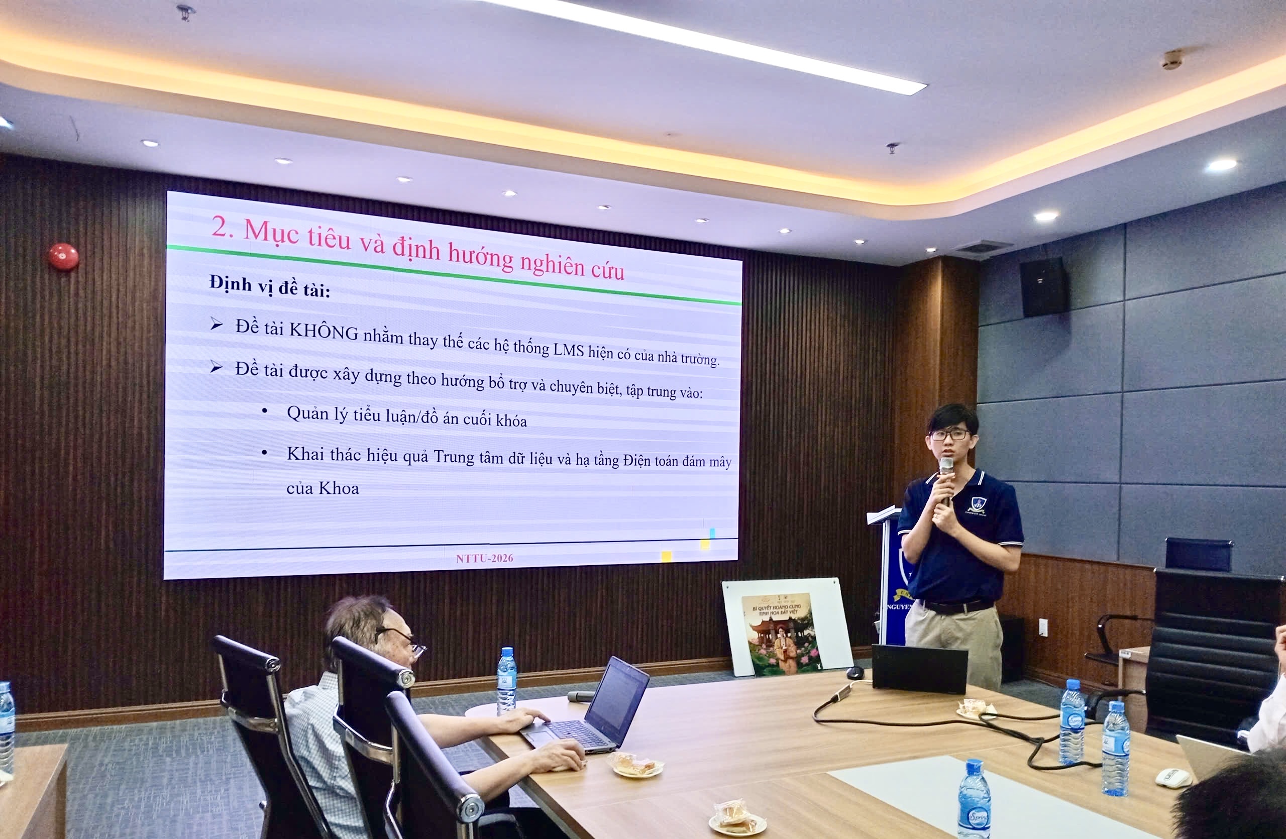Tiếp nối chương trình, ThS. Lương Trường An và ThS. Phạm Mạnh Trung Nguyên đã trình bày đề tài xây dựng website học trực tuyến kết hợp thực hành, một hướng nghiên cứu mang tính ứng dụng cao, phù hợp với xu thế chuyển đổi số trong giáo dục đại học. Đề tài tập trung vào việc thiết kế và phát triển một nền tảng học tập trực tuyến không chỉ cung cấp nội dung lý thuyết mà còn tích hợp các chức năng thực hành, bài tập tương tác, mô phỏng và đánh giá tự động.