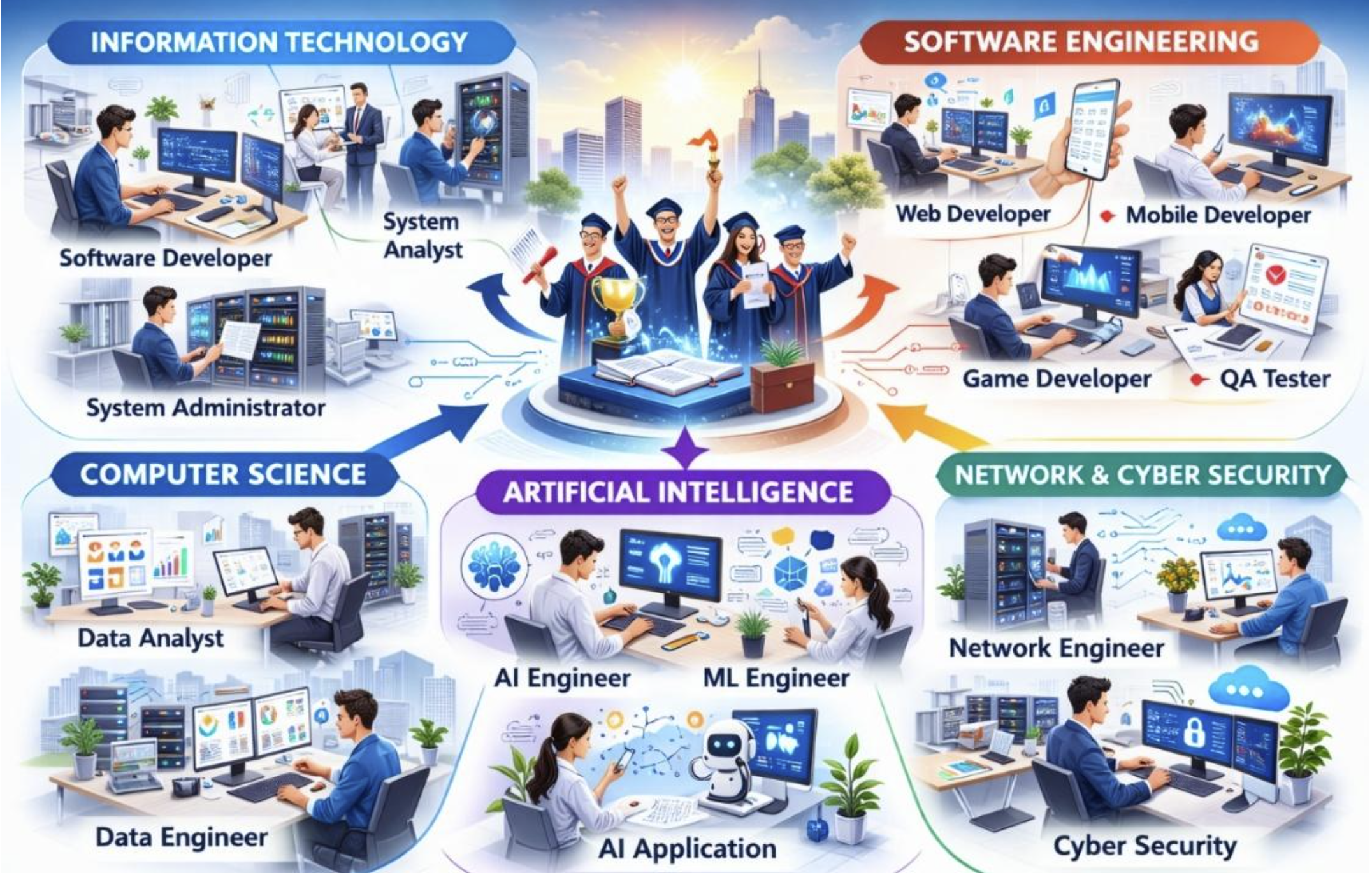 Sinh viên ngành Công nghệ thông tin có thể đảm nhận các vị trí như lập trình viên phần mềm, chuyên viên hệ thống thông tin, quản trị hệ thống hoặc tham gia xây dựng và vận hành các hệ thống công nghệ trong doanh nghiệp. Đối với ngành Kỹ thuật phần mềm, sinh viên thường phát triển theo các vị trí như Software Developer, Web Developer, Mobile Developer, Game Developer hoặc kỹ sư kiểm thử phần mềm (Software Tester/QA), tham gia trực tiếp vào quá trình phát triển, triển khai và bảo trì các sản phẩm phần mềm.